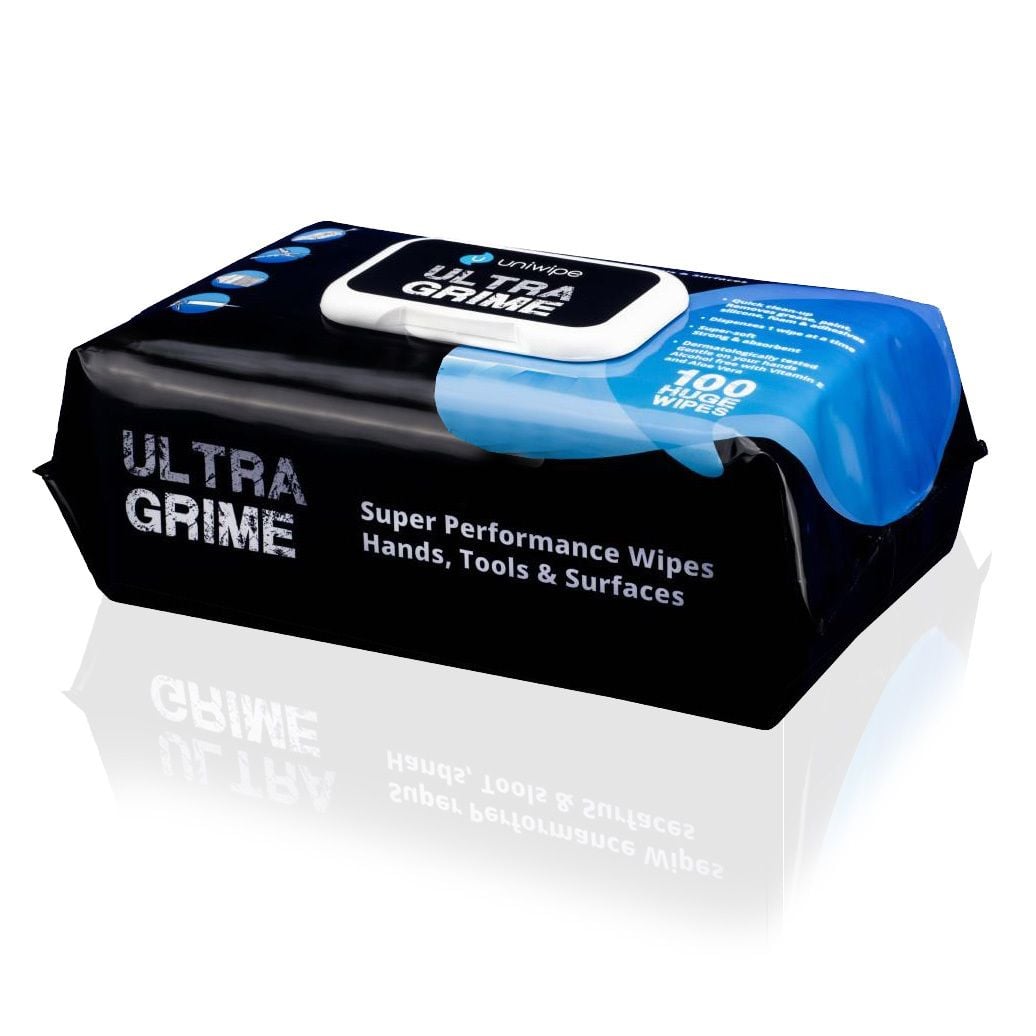 Ultra Grime Industrial Wet Wipes Resealable Pack. Ultra Grime wipes are large, strong, and effective on even the most stubborn oils, paints, greases, and inks. They are designed for people and surfaces. The wipes are alcohol-free and dermatologically tested.